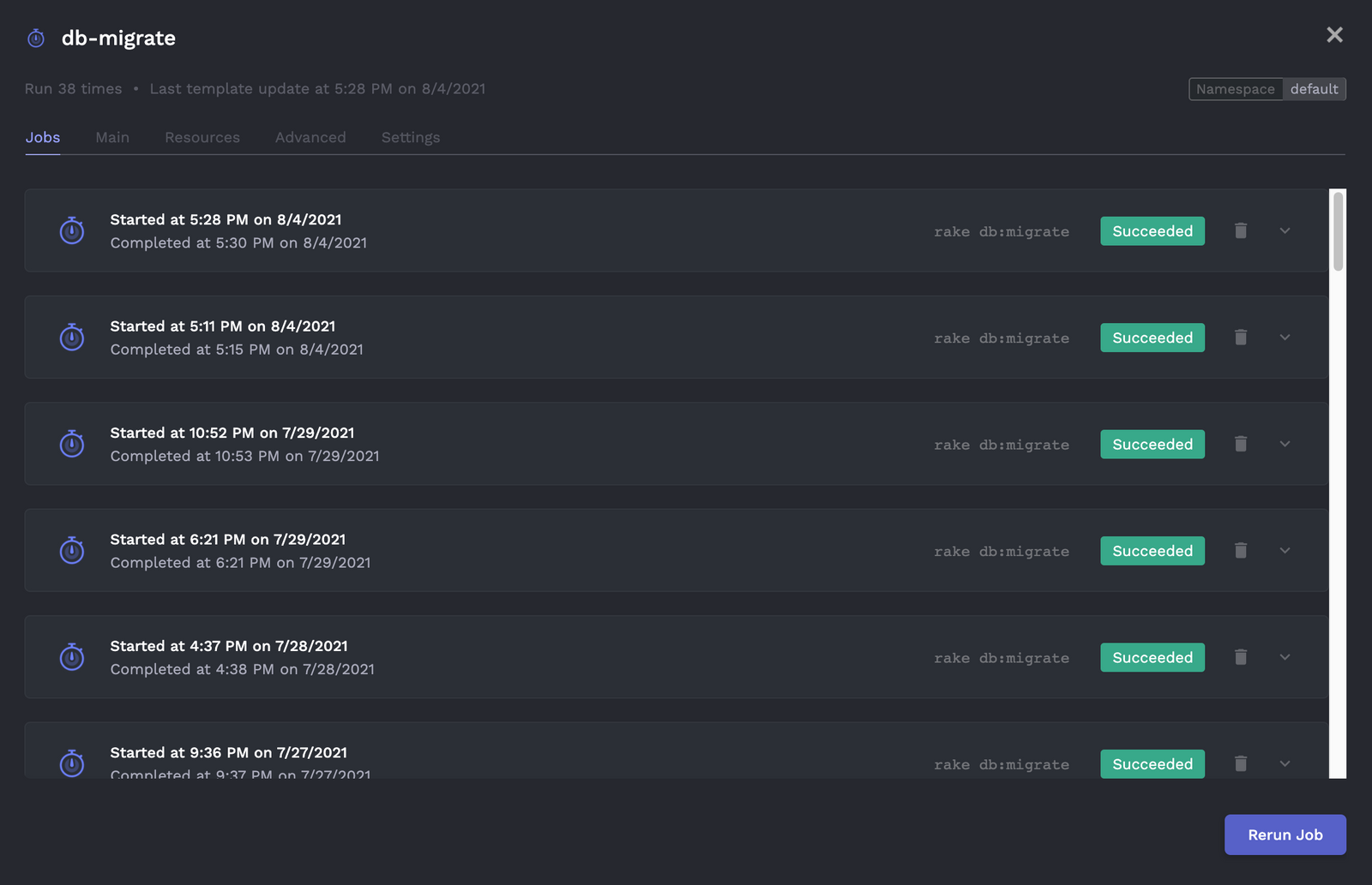 In terms of application setup, Woflow runs three web servers along with two worker processes on Porter. Their applications connect to a Postgres database that’s set up on AWS RDS, which is connected to Porter via VPC peering. Woflow’s CI/CD is handled by GitHub actions that run a set of Porter CLI commands, along with customized steps that trigger a database migration before prompting a deployment. In addition to these long running workloads, Woflow also runs two categories of jobs on Porter: one-off jobs that execute queries against the database (e.g. database seeding or migration) and cron jobs that periodically kick off third party integrations on a schedule.